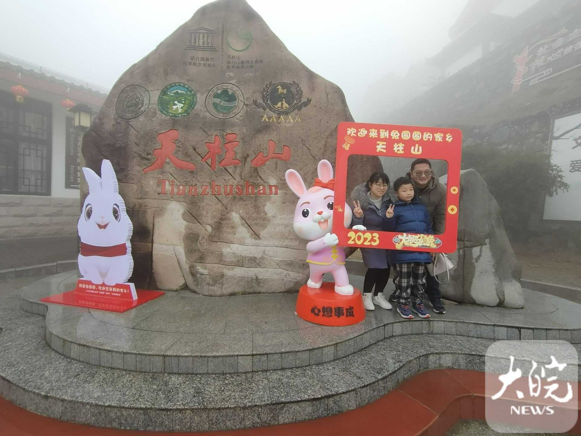春節(jié)假期,天柱山風(fēng)景美,年味濃,景區(qū)在馬祖、茶莊游客中心、天池峰等多處設(shè)有歡慶新年的“兔圓圓”卡通形象,游客在這里拍照,許下美好愿望。“今年春節(jié)帶著家人在天柱山旅游過年,提前在網(wǎng)上預(yù)訂好民宿,一家人開心快樂地體驗(yàn)山岳風(fēng)情,吃農(nóng)家菜、看民俗、滑冰雪、賞美景,體驗(yàn)“慢生活”,在“兔圓圓”故鄉(xiāng)過兔年,意義非凡?!眮碜陨虾5挠嘞壬_心地說。