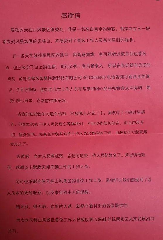 “感謝天柱山風景區(qū)默默無聞辛勤工作的工作人員,是你們讓我們感受到了以人為本的周到服務,以及來自陌生人的溫暖,祝愿景區(qū)未來發(fā)展如日方升……”5月8日下午,天柱山景區(qū)收到了一封來自南京游客的感謝信。紙短情長,字字暖心,流露出對天柱山工作人員的充分認可和信賴,深切地表達了對天柱山景區(qū)的感激之情。