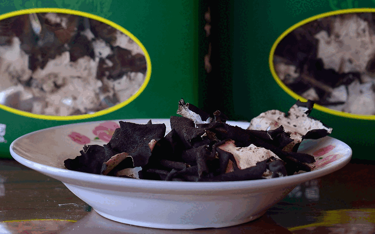 屬地衣門石耳科,菌體葉狀,正面為灰白或灰綠色,反面為黑褐色,多生長于海拔700-2000米懸崖峭壁的陰濕石縫間。石耳常以小群落的形式分布,少則幾片,多則百余片。一公斤干石耳約1400片左右,因而極其珍貴。石耳的藥用價值很高,《神農(nóng)本草經(jīng)》就把它列為上等藥材。其主要成份有氨基酸、卵磷質(zhì)和多種微金屬元素。有滋陰潤肺、治療高血壓和各種熱癥等攻效,對抑制腫瘤、出血也有積極作用。同時石耳亦可佐菜食用。“石耳燉甲魚”、“石耳烏雞湯”等乃為上等佳肴。天柱山地處江淮之間,氣候溫和、雨量充沛,終年云霧繚繞,且境內(nèi)群山環(huán)繞,海拔千米以上的雄峰45座,是石耳生長的理想之地。